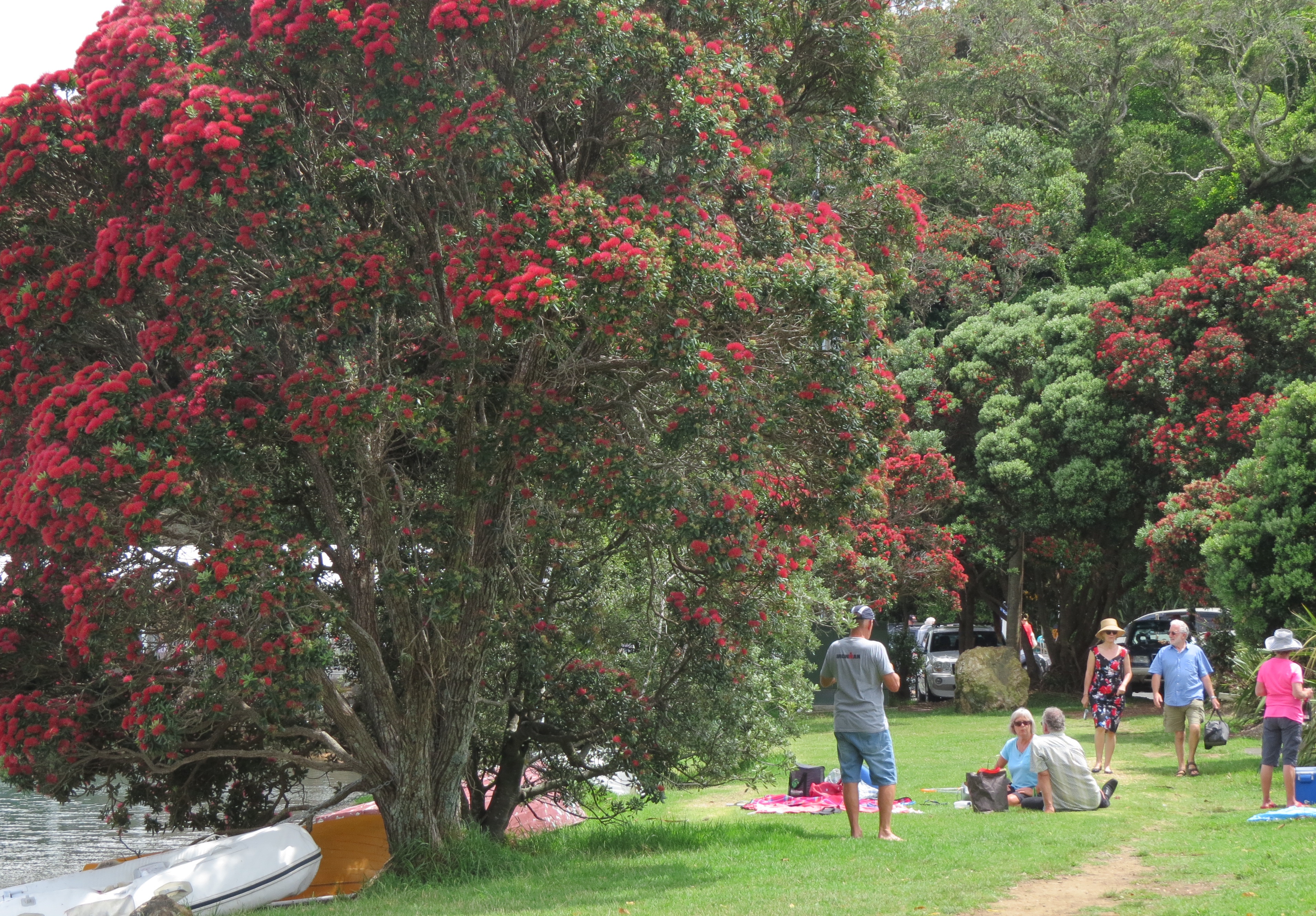 For those who don’t know about it the island is only about 35 minutes from Auckland on the pedestrian ferry or 45 minutes to 1 hr from Halfmoon Bay on the vehicular ferry. (Driving from Auckland city to Halfmoon Bay takes longer!) At this time of year the pohutukawa trees are blooming everywhere. Although not quite the orange-red of the Queensland flame tree, the colour is spectacular especially when in full sun.The sea sparkles and all the little bays and beaches flaunt suntanned people having fun.