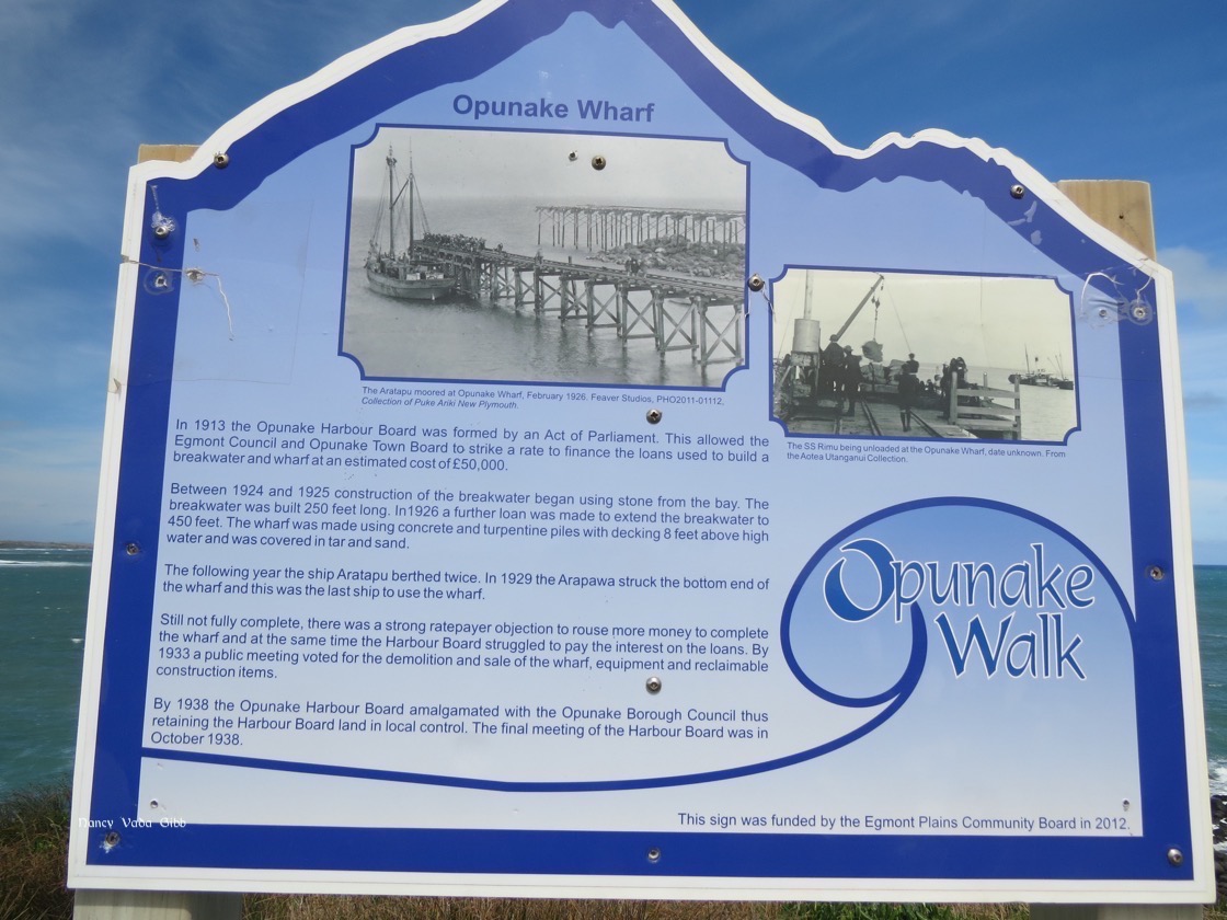 Opunake was a lovely little bay with an interesting history and lots of signs to inform us about it. Long used by the maori, the militia arrived in 1869. According to a sign a steep road from the beach to the cliff top and a 300 ft jetty were in place by 1882. It was washed away in a storm and another built in 1899, and used until 1924. The remains are in the photos.
