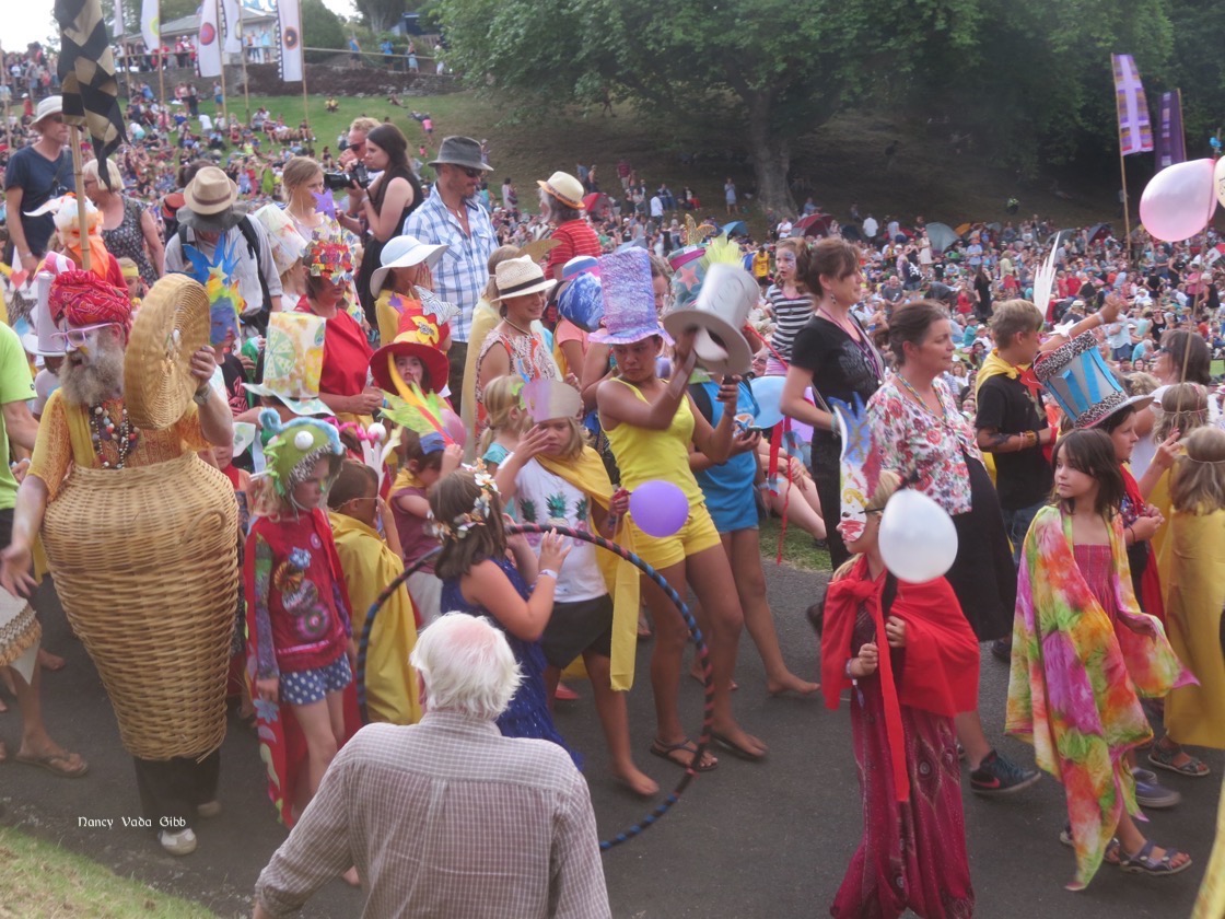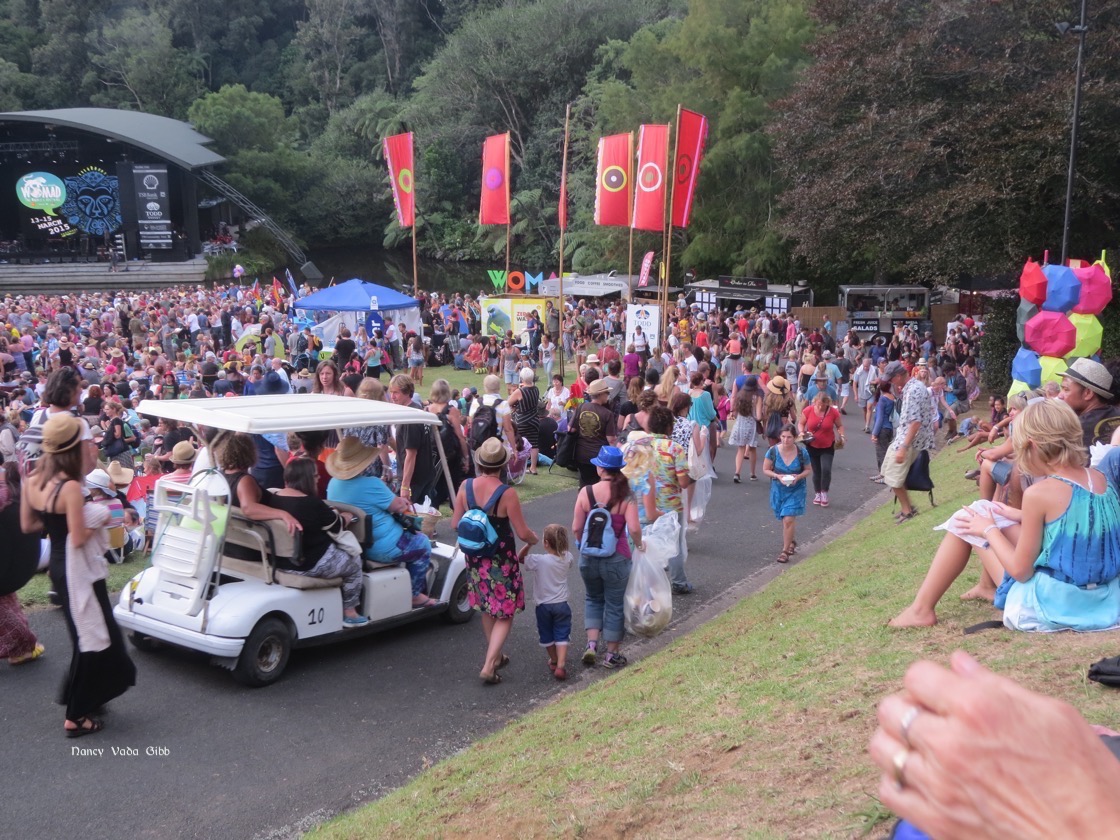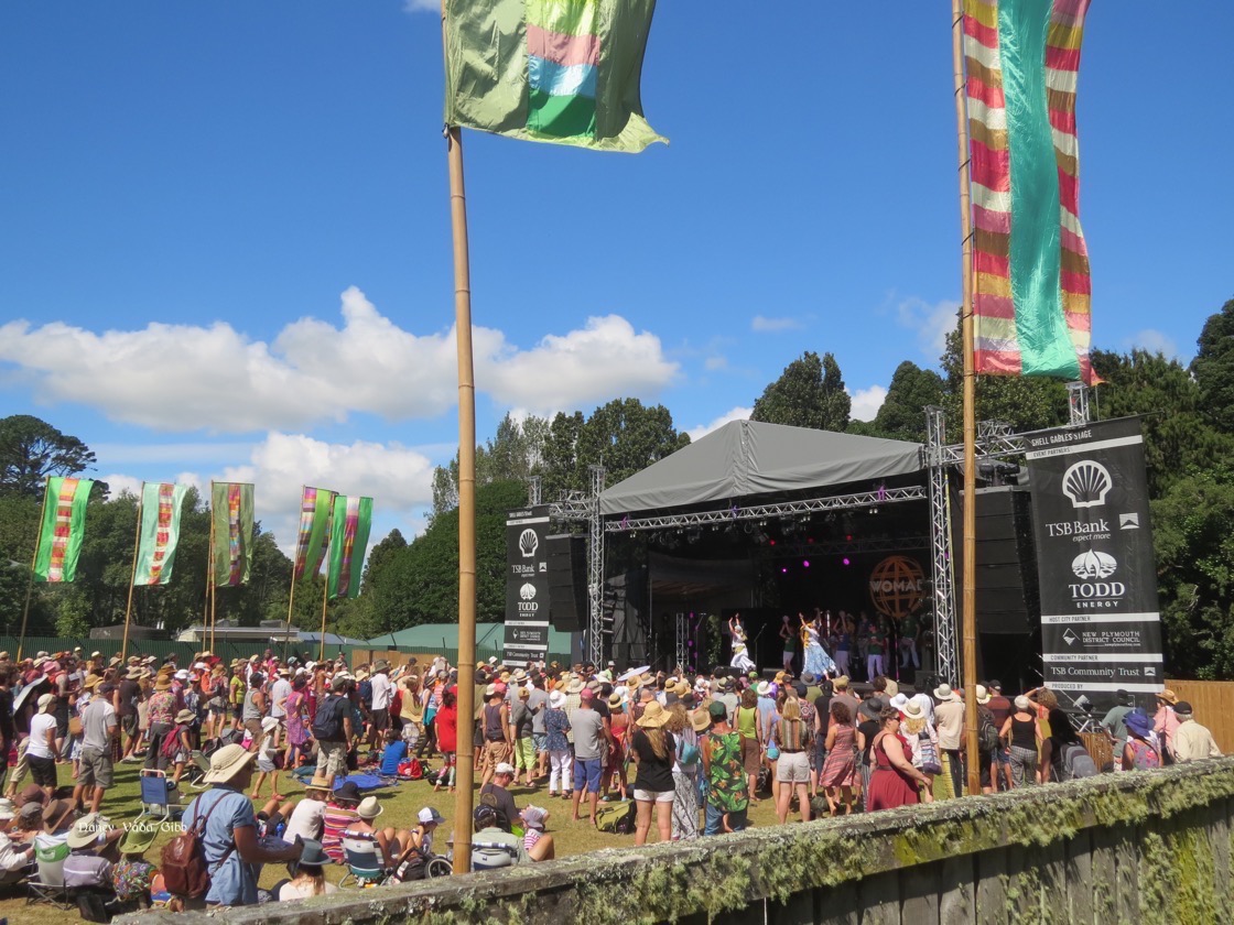 It was a wonderful sensuous swirling mix of music, colours, smells, smiles and sunshine. On Brooklands Hill next to the New Plymouth racecourse, the entrance was a very steep downhill then an equally steep uphill walk with some sidetracking along the way to view various art installations and an infinite array of delights along the ridge. A total of 6 stages ranged from the enormous TSB Bowl at the bottom of the huge natural amphitheatre to the tiny little Te Paepae Maori stage. A shuttle service up and down the hill was provided for artists and disabled people. On the last evening we noticed some older people being given lifts too – wish we had asked earlier!