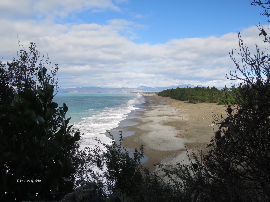 Dave has been the chief dog walker while I took over the awesome kitchen with its super fast touch-controlled ceramic stove top which can boil a kettle in just a minute. This house has more glass than walls, a beautiful cork tiled floor throughout, and huge cupboards with space for most things so the house has a clean minimalist look with just a few quality pieces of art on the walls. Doubtless due to the looming mountain range to the north it is colder here at the beach than in Blenheim and washing takes longer to dry; we are glad of the wonderful wood-burner fire in the evenings.
