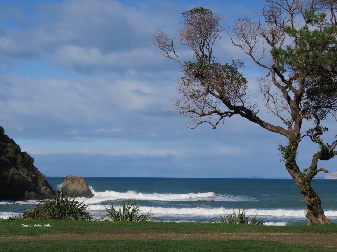 Before starting up the hill we had a look at Monkey Bay at the end of Rarangi Beach Road.. Definitely not a place to go swimming. A cave leads right through the rock and water can be seen swirling around at the other end.