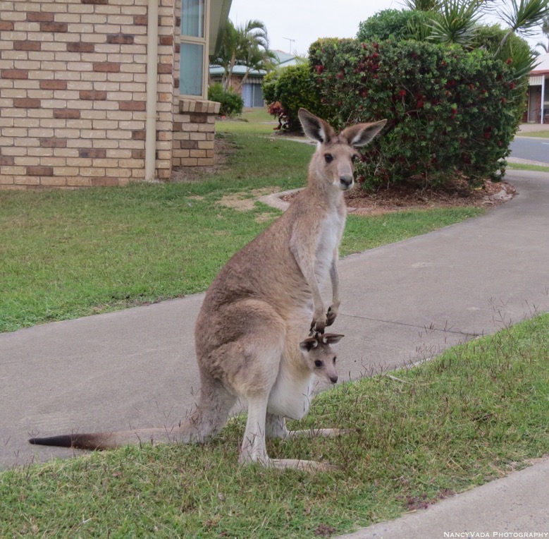 We were met by a Darchy cousin ‘Darch’ and his wife Jan and driven to their retirement village at Yeppoon, about half an hour further north. The village is HUGE and attractive and has some unique lawnmowers – wild kangaroos which roam the streets freely. I was astonished to see so many in an urban area. Perhaps the lack of children and also dogs and cats makes it feel safe for them. Apparently they leave vegetable gardens alone and only occasionally feast on flowers.