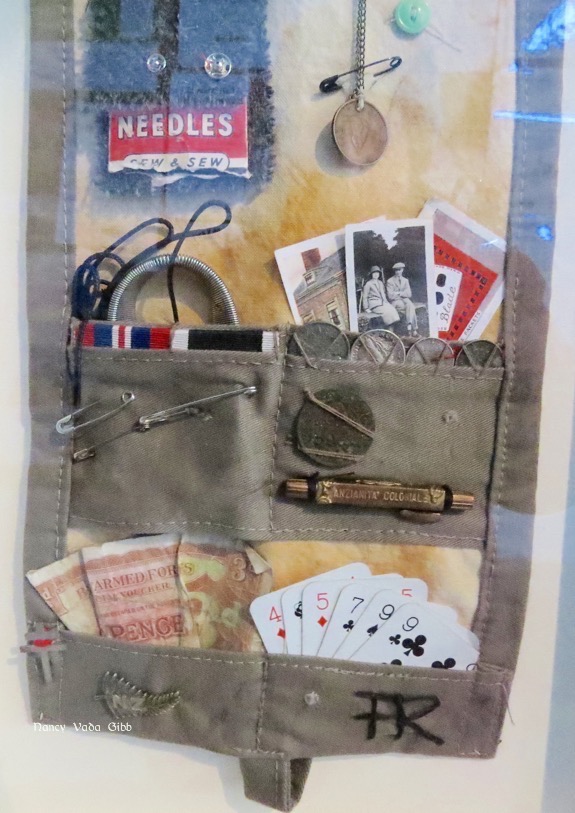 The crafter in me was also attracted by another display, two shadow boxes full of mementoes carefully displayed in little pockets … the photos tell more than I can (unfortunately reflections in the glass made good photos difficult). I have a number of such mementoes belonging to my late father in law Squadron Leader Bill Hoffmann; now at last I have an idea as to what to do with them. But it will have to wait till our caravanning days are if not over at least not continuous and I can access my stored boxes of family history in Christchurch.