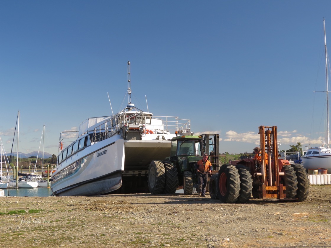 We’d had lunch at the Jester House and were due to meet Viv for coffee at Toad Hall – popular local names! – but were late for the latter as we discovered a huge local ferry in a shipyard, being prepared for relaunching. This was the ferry on which a wedding party travelled from KeriKeri to Mapua the day before Penny went missing last year. It was awesome watching the huge monster being manoeuvred by a single tractor, with one other called in temporarily when everything got bogged!