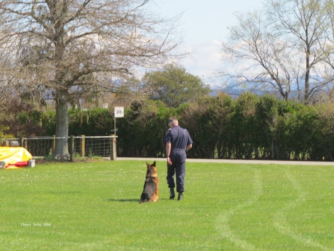 The grass everywhere was very green and identical brown horses covered with identical horse blankets grazed everywhere in the outlying paddocks – how do the owners tell them apart? Sheep grazed in the middle of the racetrack. A young police dog was being put through its paces in a back area.