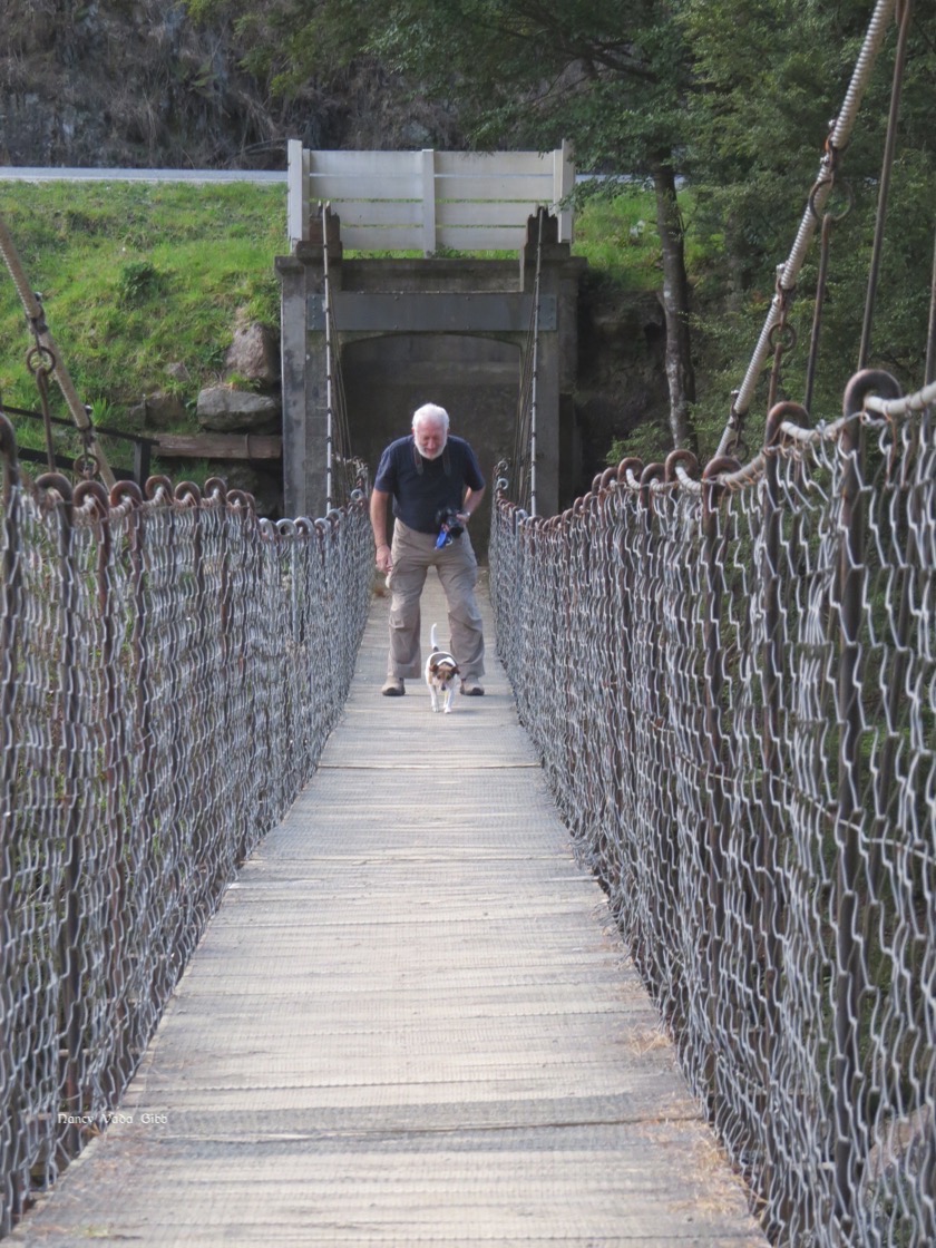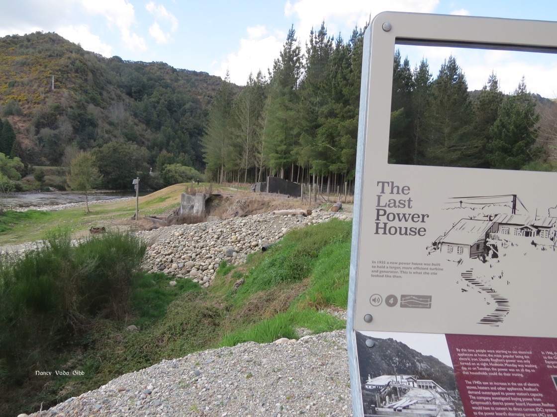 A little further on towards the town we stopped to investigate the swing bridge which takes one over the Inangahua river and to the site of an early power station. The area is just so rich not only in mining history but in the history of electricity in NZ – Reefton was the first town in the southern hemisphere to establish its own power station. Penny was not so keen on this swing bridge…)