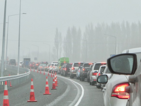 We thought it would be a quickish run up to Glenmark, considering the weather, but road maintenance meant a loooong queue leading up to the Waimak bridge, under which the water was flowing strongly.