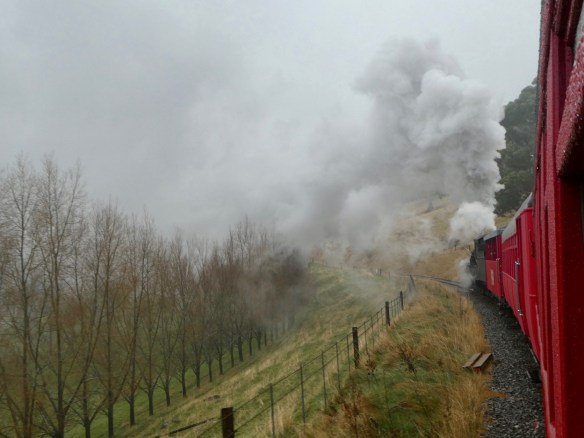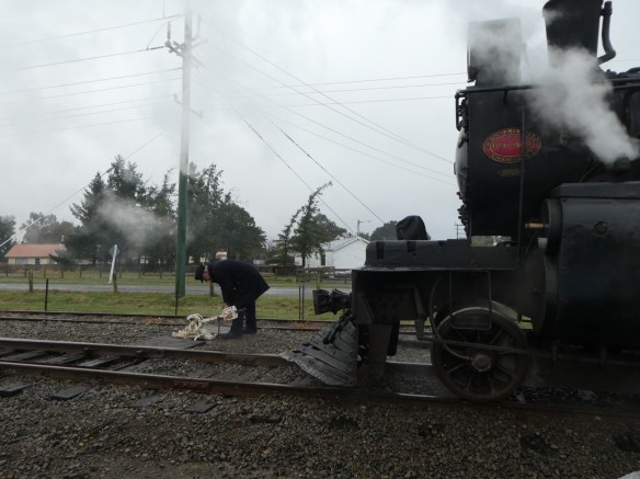 The engine was uncoupled, shunted down a side track then back to the end of the train where it was hard to see what was happening amidst the steam and rain!