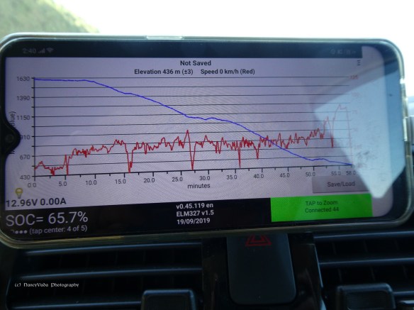 We left the skifield about 2.30 and drove down to Highway 73 in B mode for hopefully maximum regeneration. Arrived at the highway 73 after travelling 17 km. SOC was 69% so regen gave us 11% back but the GOM said we could now travel 123 km.