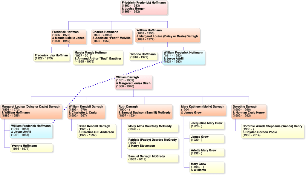 In the top photo, In the front row is Bill’s mother Dorothy “Daisy” (Darragh) Hoffmann (1891-1972) and Bill’s widow Joyce “Joy” (Attrill) Hoffmann (1921-1983) with Joy’s father Syd Attrill immediately behind them. Syd is easily identified from other family photos, as are Daisy and Joy. The man to Joy’s left is most likely Bill’s father William Hoffmann (1899-1955), a Belfast hairdresser, and almost obscured behind him, Bill’s sister Yvonne (1918 – 1977) who never married – all are in the front row again in the second photo.