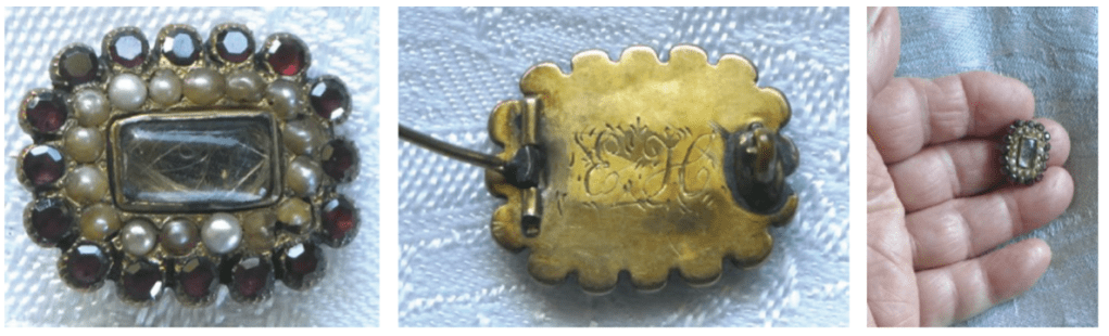 My aunt passed on to me a lovely little Memento Mori, a brooch of amethyst and seed pearls containing a lock of golden hair and inscribed on the back EH.
