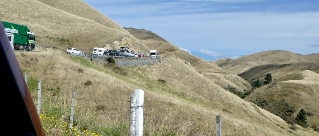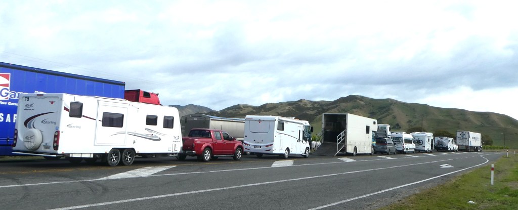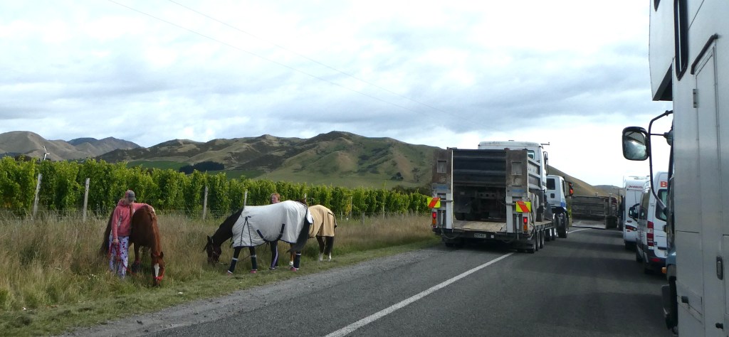 It was beautiful sunny weather with signs of autumn just appearing in the roadside poplars. The Wairarapa vineyards were still draped in netting, in contrast to further north where grape harvesting has finished. Which meant many heavily-laden trucks full of loose grapes. Which meant when negotiating a particularly tricky turn at the southern end of the Dashwood Pass, a truck overturned … grapes everywhere … and the highway was closed for over 6 hours. Cars were diverted down a narrow twisty road but we, together with hundreds of caravans, motorhomes, lorries, a horse float and sundry other large vehicles were parked in two orderly lines covering the road (that’s us with the red ute). Nobody seemed to be complaining and little pockets of friendship sprung up. Horses were unloaded and grazed by the roadside. The truckie next to us happily accepted the offer of a cup of tea.