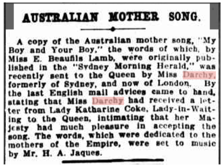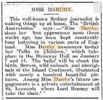 Through her own courage, determination and energy she soon became a well-known journalist, being in charge of the Social and Fashion columns of an Australian daily newspaper. According to an article on the Lady Journalists of NSW, “A great deal of tact and discretion is required in one who has the control of the social department of a large daily paper, and during the times that Miss Darchy has managed that portion of the Telegraph she has exhibited those qualifications to the fullest extent…..The lady who supplies the social and fashion news to a big daily journal in a large city like Sydney has abundant work to do; but Miss Darchy is active and industrious, and by economy of time manages to (also) contribute regularly to a daily paper in Paris and to send a colonial letter periodically to the Sketch, an illustrated journal published in London. She also writes for several country papers in New South Wales….”