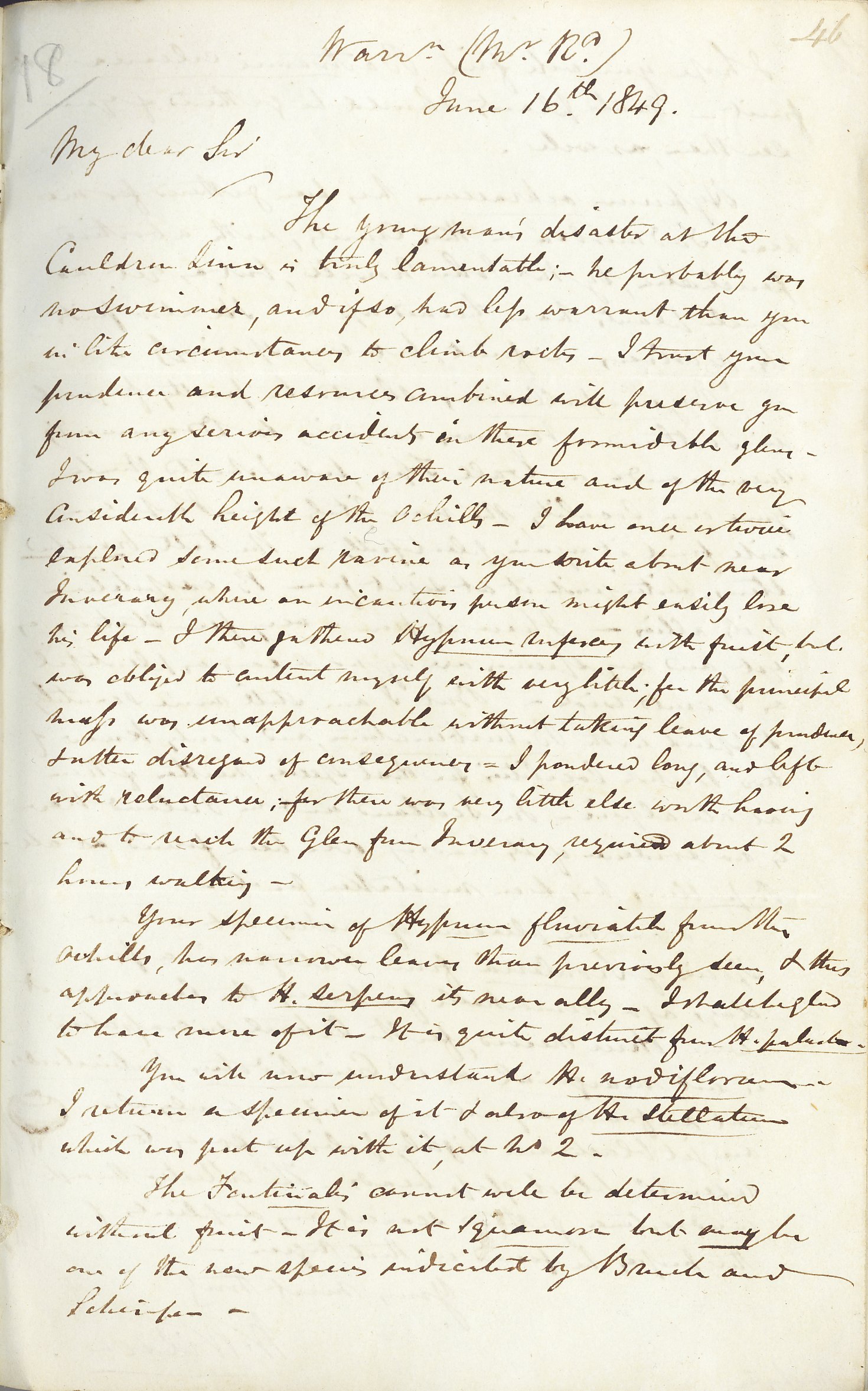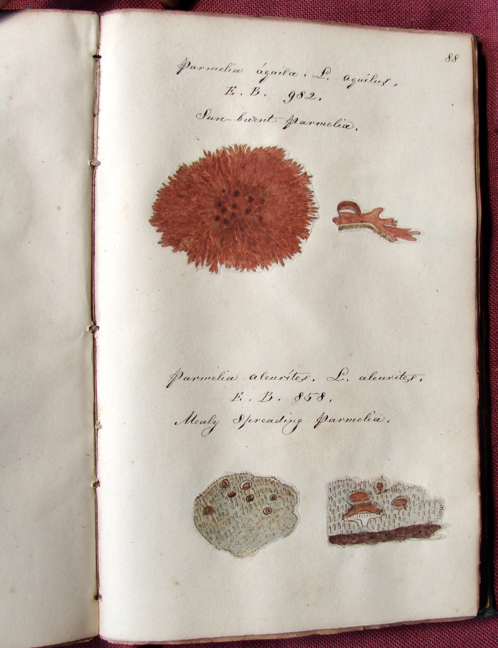 He maintained a voluminous correspondence with Mr. William Wilson of Manchester, a world authority on mosses. I have in my possession two wonderful hand-bound books – one is a collection of letters from Mr. Wilson covering the period 1849 to 1854. The other is an exquisite book full of watercolours of mosses, meticulously catalogued.