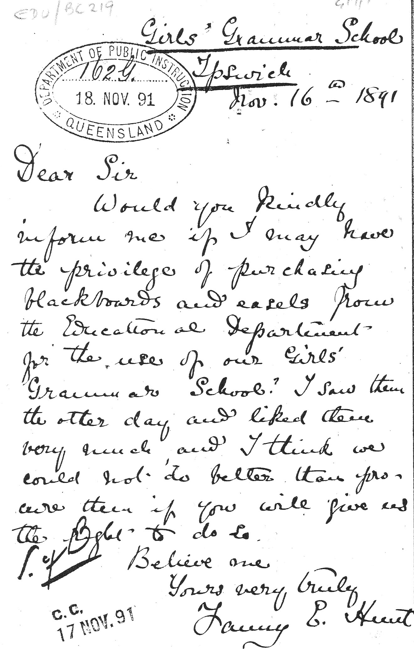 In 1889 Miss Hunt opened the Girls Grammar School at Ipswich, Queensland. She remained there for many years before retiring because of ill health. After visiting England she opened Girton College Toowoomba where she remained until 1910.
