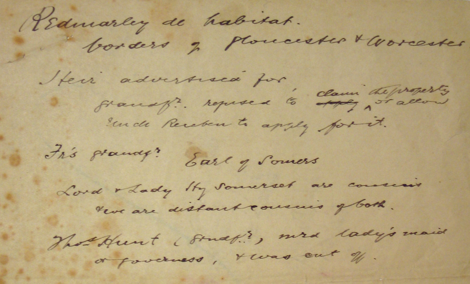 Another family legend is that Thomas HUNT was a relative of the Earl of Somers and that when the Earl died GGF Thomas forbid his son to apply as heir, because he had married a lady’s maid or governess (he most likely did). This has been explored further in another article (“Our Hunt Family Coat of Arms”).