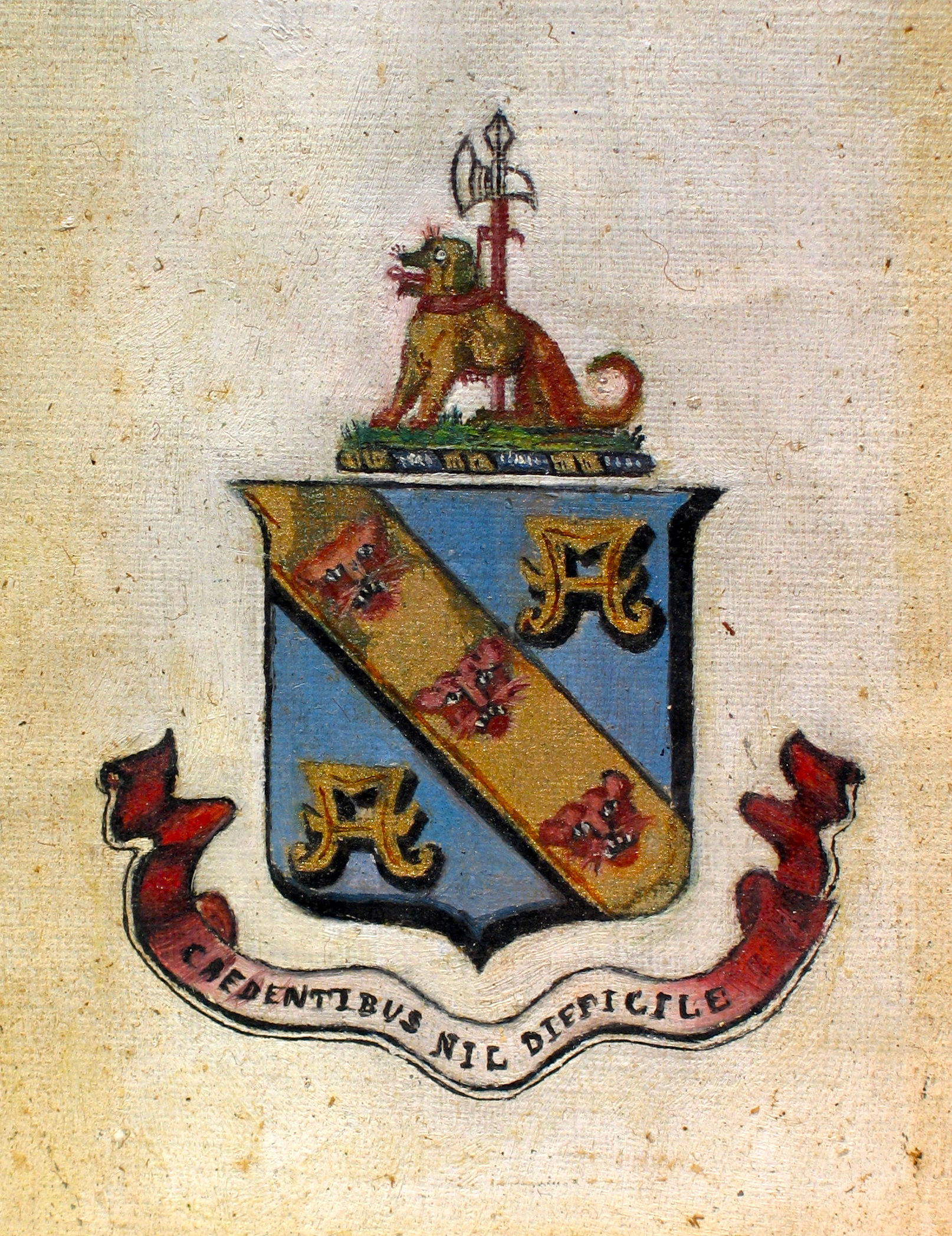 The Hunt COA motto is Credentibus nil difficile which means “Nothing is difficult to believe” – a very apt motto in this case! It also occurs in one stylised American coat of arms (from an American website for heraldry clipart). Other so-called Hunt coats of arms have a different motto, notably Cor nobyle, Cor immobyle which means “A heart noble, a mind determined” according to one translation and “A noble heart, a heart immovable” according to another. Incidentally this particular motto was attributed to Hunt of Ashover by an American website specialising in buying and selling old silverware, but Fairbairn does not list such a motto. In an old book called Burke’s General Armory of England, Scotland, Ireland and Wales published 1884, Cor nobyle, cor immobyle is the motto for families named Symons, Vivian, Hussey and Hyett (no Hunt). The Credentibus motto isn’t listed in this book. Apparently mottoes were not generally displayed with coats of arms.