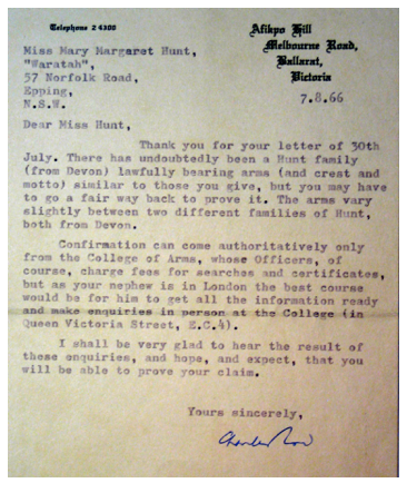 Two of my HUNT family ancestors, Mary Margaret Hunt (1900-1979) the daughter of Edwin Herbert Hunt, and Betty d’Archy (1910-1997) the daughter of Edwin Herbert’s sister Lily (Hunt) d’Archy, both had copies of the beautiful family coat of arms shown below, hand-painted on parchment. (It will be referred to as the ‘Hunt COA’ from now on). The provenance of the artwork is unknown, but the shield is believed to have been copied from some embossed stationery about the time of Edwin Herbert Hunt. Possibly his son Herbert William Hunt (1913-1937), said to be an artist of exceptional talent, was responsible. Edwin Herbert’s granddaughter Eleanor (Hunt) Symons has given Mary’s copy to the author and the other is in the safekeeping of Kirkwood Johnston, great nephew of Betty d’Archy.