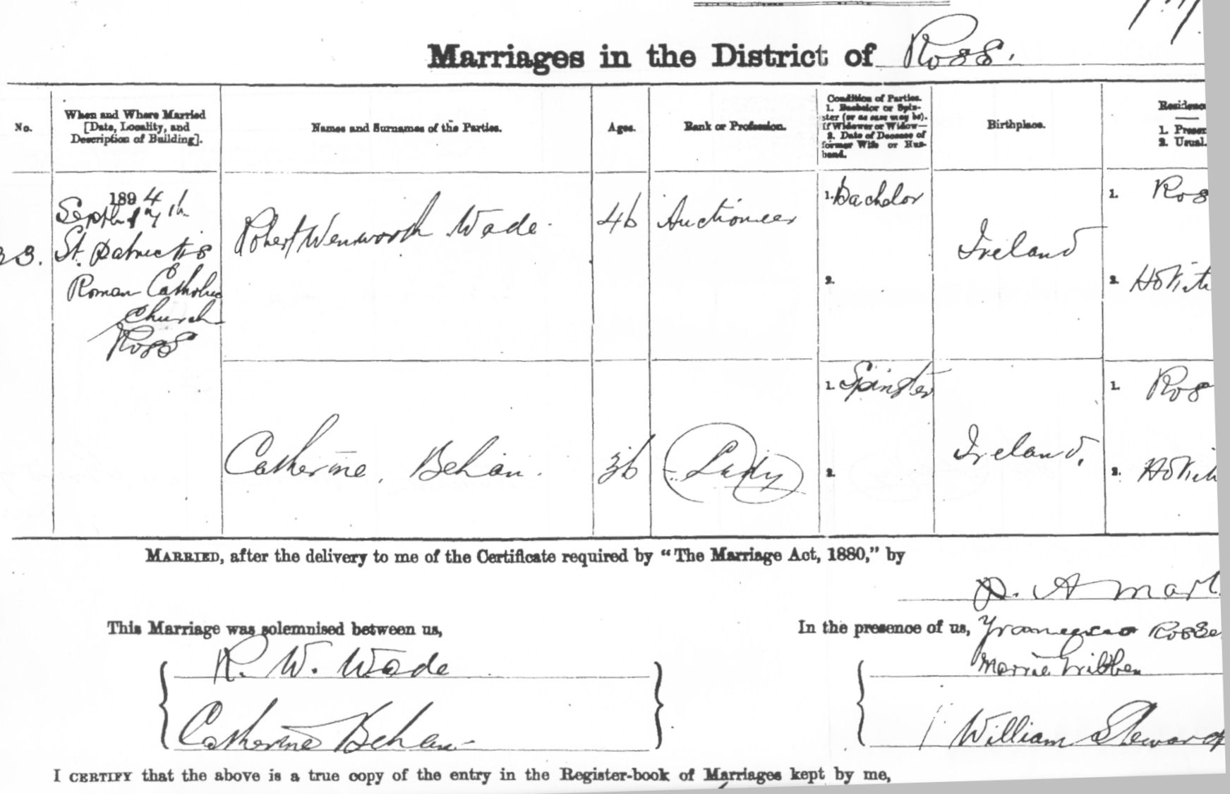My great great uncle Robert Wentworth Wade was the Mayor of Hokitika between 1892 and 1894 and a councillor for several years on either side of those dates. I knew he had married an Irishwoman, Kate Behan, although it was some years before I found the actual record of their marriage. Having a reasonable amount of information about Robert, I decided to investigate Kate a little further.
