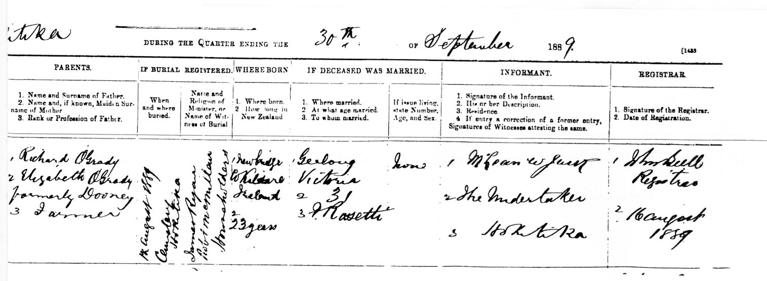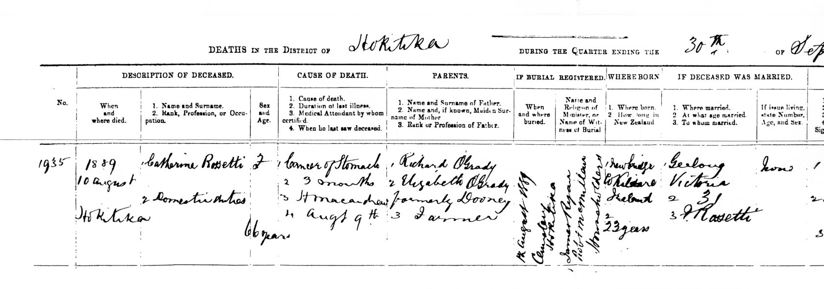 The marriage certificate told me that Catherine (Kate) Behan was born in Ireland to Peter Behan, a farmer, and Bridget O’Grady. Knowing the difficulty of searching Irish records, I wondered if Dr. Rossetti could lead me to discover more about Kate’s origins. The surname Rossetti was not listed as a surname of interest in the NZSG so I asked on the NZ Rootsweb list and was immediately sent information from a private database of early NZ doctors.