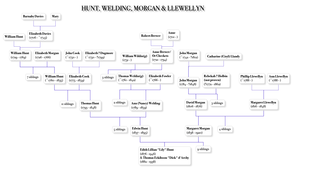 Their son Edwin Hunt, a headmaster, married Welshwoman Margaret Morgan, yet another teacher. Her grandparents are believed to have been unrelated Llewellyns.