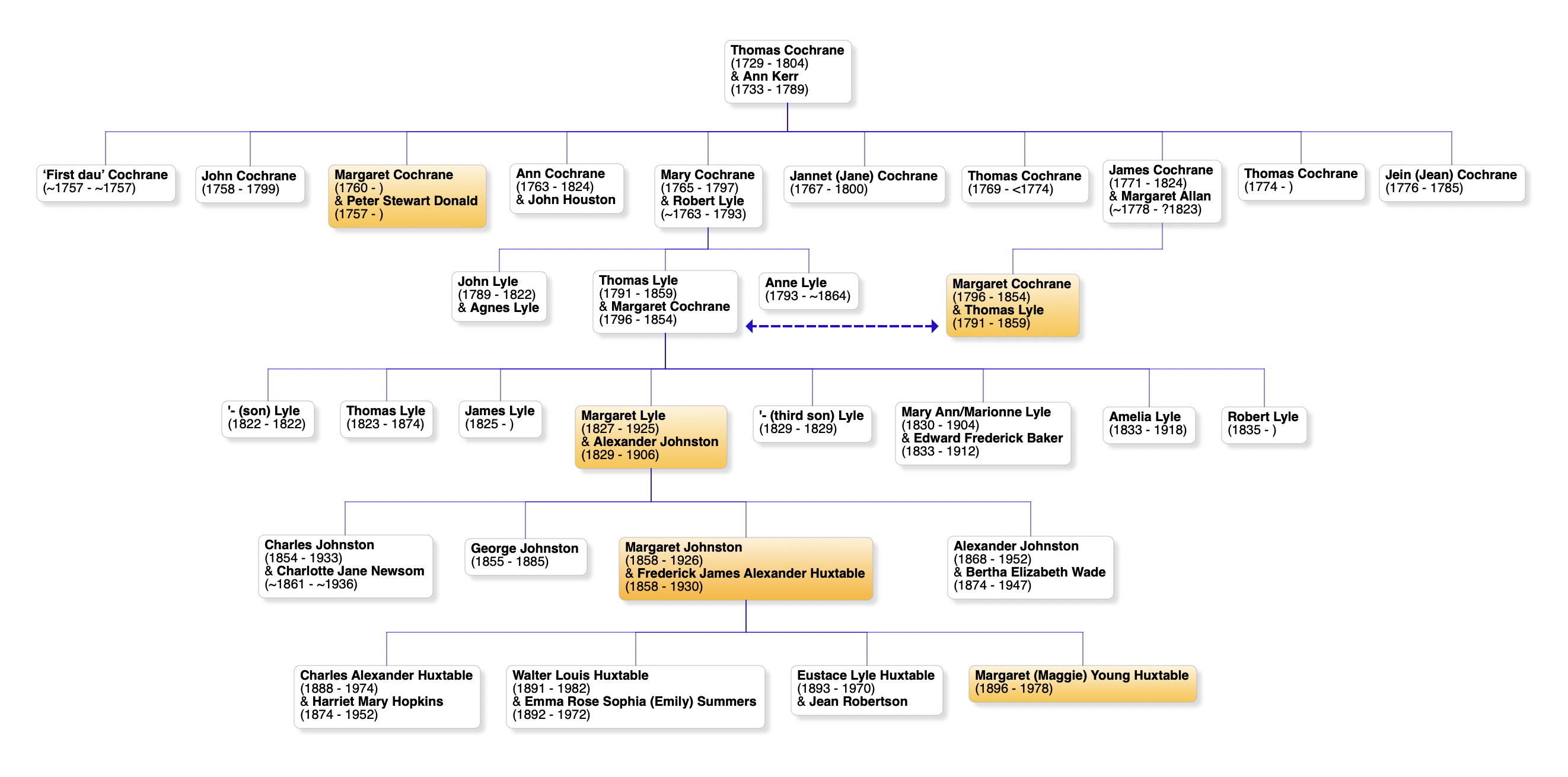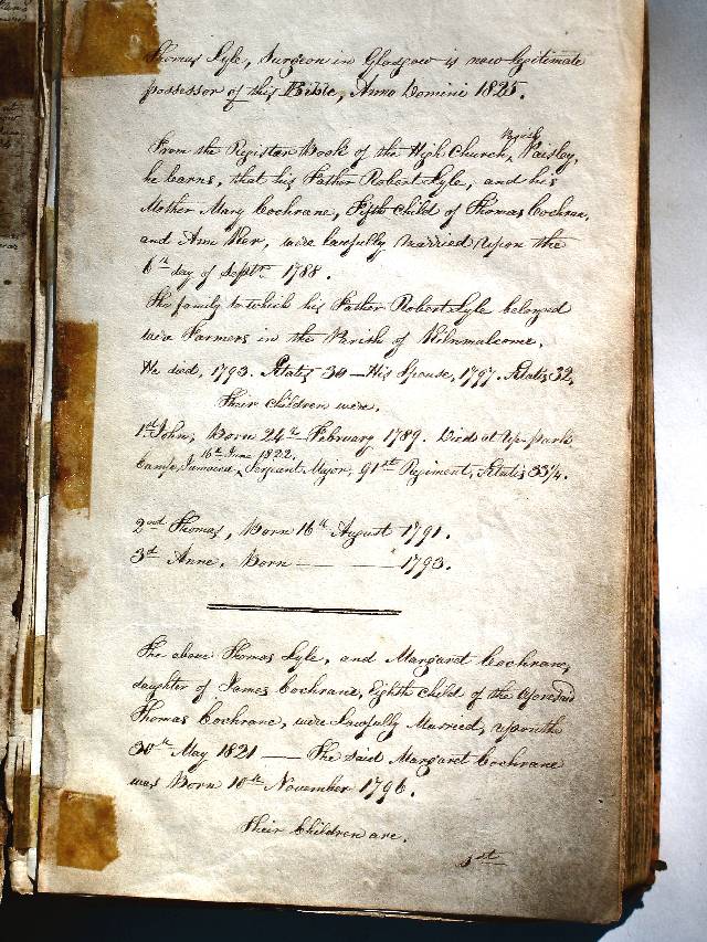 Margaret the Second married her cousin Dr. Thomas Lyle on 30 May 1821. Thomas was the son of Margaret the First’s sister Mary Cochran(e) 1765-1797 and Robert Lyle 1763-1793. Dr Lyle wrote in the Bible: