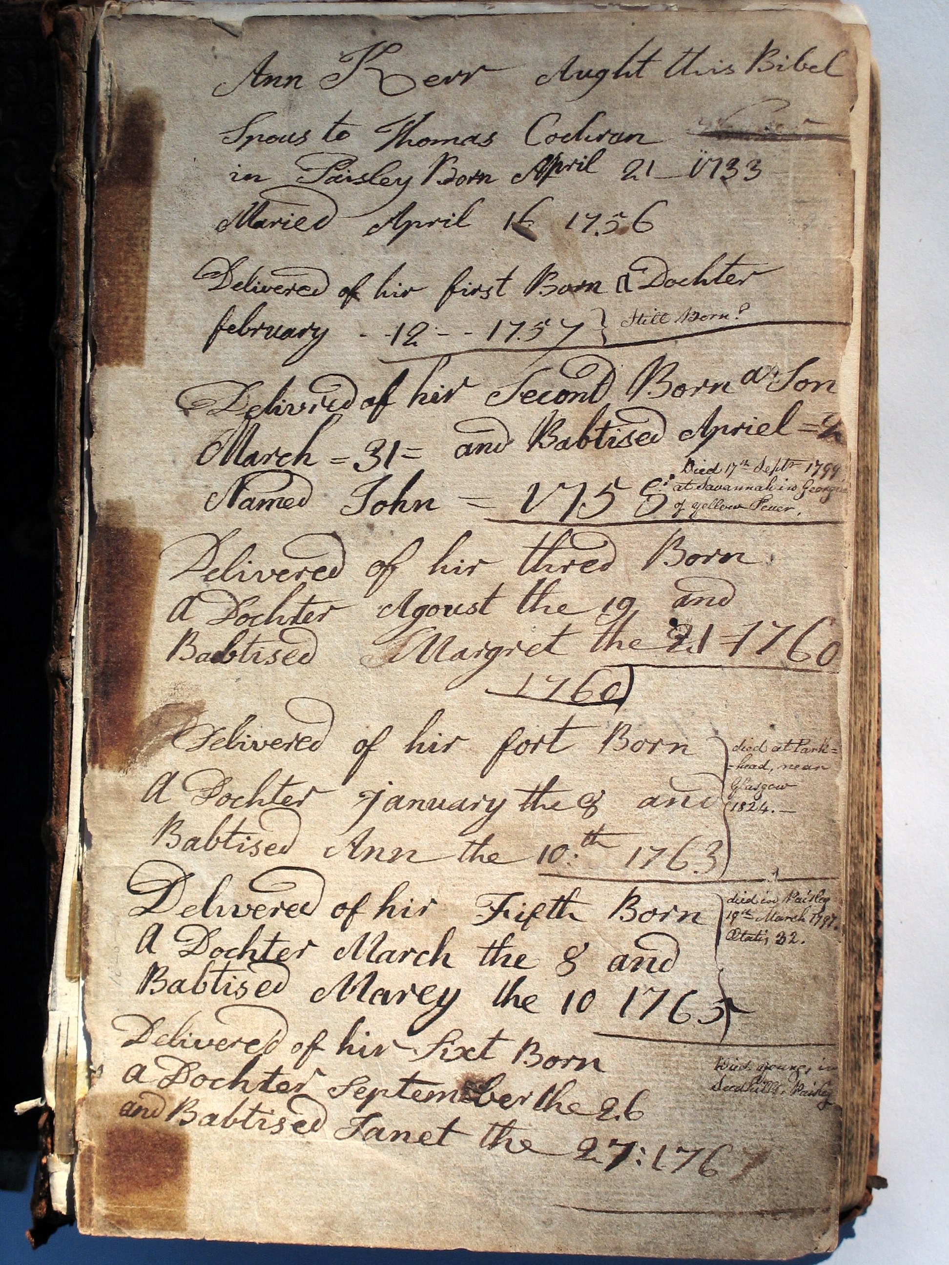 The first Margaret (Cochran), who was most likely named after her mother Ann Kerr’s mother if the family followed Scottish naming patterns, was born on 19 August 1760 in Paisley and baptised in the Abbey Church two days later. Her mother Ann Kerr carefully recorded her birth in a large family bible which she had “aught” (bought) following her marriage to Thomas Cochran in Paisley on 16 April, 1756.