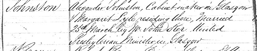 Margaret the Third was working as a cap maker in Glasgow when she met the young Alexander Johnston, a carpenter and precentor (choir leader). The Johnstons were solid Glasgow stock, painters or shoemakers; Alexander’s brothers were a shoemaker, tailor, Sheriff’s officer and gas fitter, carver and gilder, and Congregational Minister respectively. His lone sister married a Free Church minister. The marriage was in Glasgow on 25th March 1853. the Minister who married them was a John Ker – probably just a coincidence.