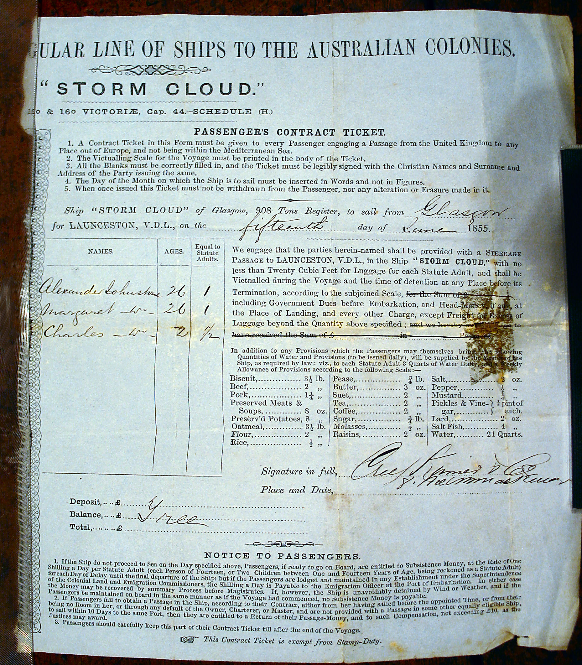 When baby Charles was less than two years old and Margaret was pregnant with her second, the family embarked for Tasmania on board the “Storm Cloud”, a new clipper sloop of 907 tons, built 1854 in Glasgow. Alexander and Margaret’s voyage was sponsored by St. Andrew’s Immigration Society; they came to Australia under engagement to St. Andrew’s Presbyterian church in Launceston, where Alexander took up a position as precentor or a choir leader. A cabinetmaker by trade, he also carried out his own cabinetmaking business in Brisbane St. Launceston.