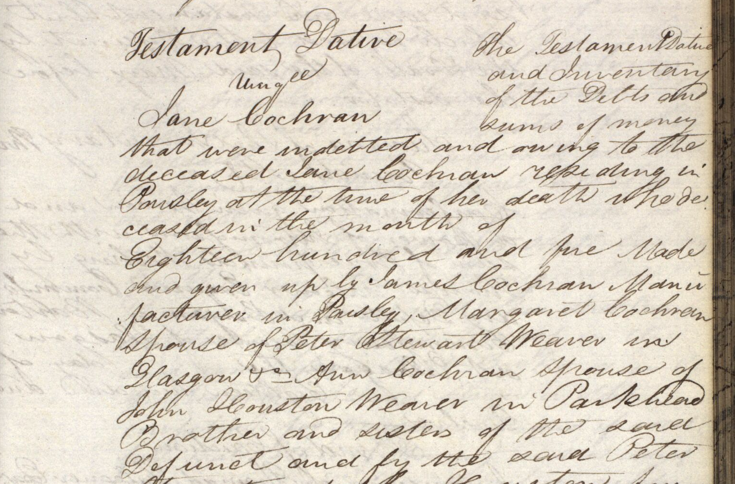 Part of the latter named some of her siblings, which enabled positive identifications: “….Made and given up by James Cochran manufacturer in Paisley, Margaret Cochran spouse of Peter Stewart Weaver in Glasgow and Ann Cochran spouse of John Houston weaver in Parkhead Brother and sisters of the said Defunct ….”