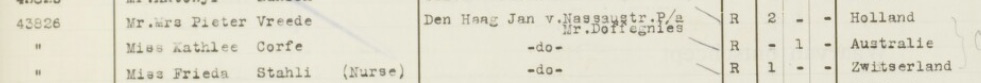 In May 1944 Miss Maisie Kathleen Vreede was on the “Nestor” in Fremantle, Australia, in First class, having boarded at Liverpool and due to embark at Melbourne; she gave her address as Ballards Mead, Limpsfield, Surrey and her occupation as Netherlands government Official. Her Australian address was c/- the Commonwealth Bank, Melbourne. Another list gives British passengers embarking on the “Nestor” and this time Maisie is “Corfe-Vreede, Maisie K, Miss”, aged 29. She was alone.