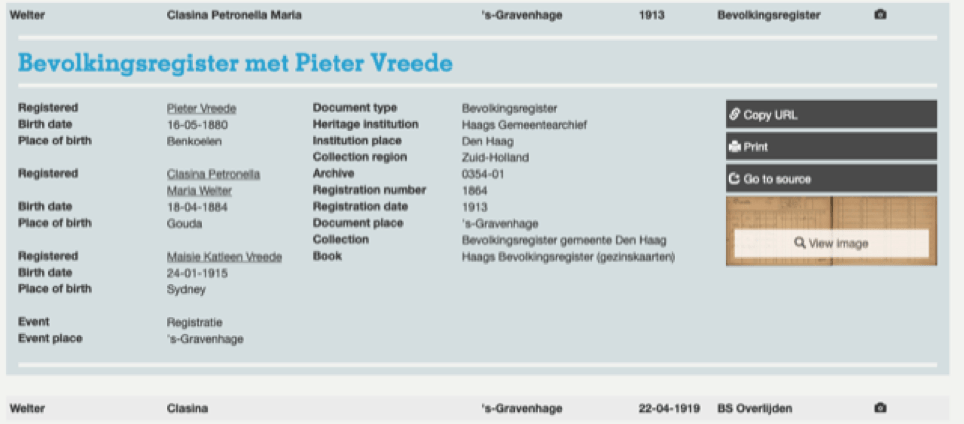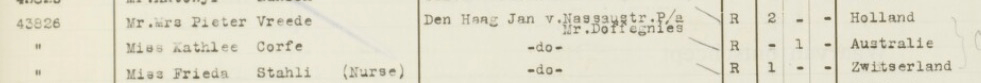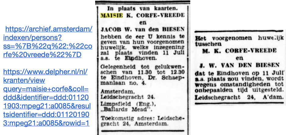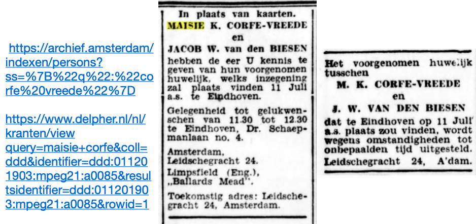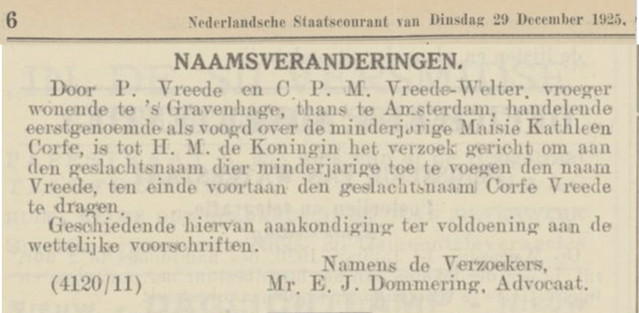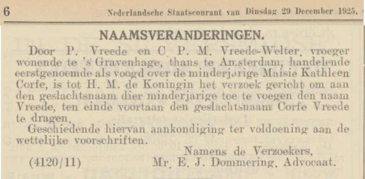 A civil registry of The Hague for 1925 gives Maisie registered under the name Corfe and a note with the address saying she lived with P. Vreede (foster parent). As we know her parents applied to legally change her name later that year. Another record shows the family moved from The Hague to London in 1925.