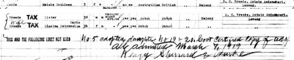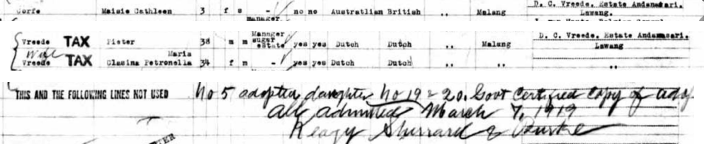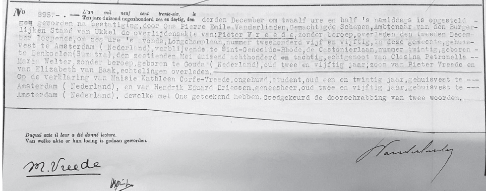 Paul discovered an official Dutch record dated 29 December 1925 which details a request by Maisie’s foster parents to have her name legally changed to Corfe-Vreede. So that solved one mystery. Maisie was adopted.