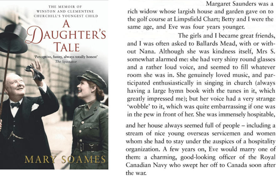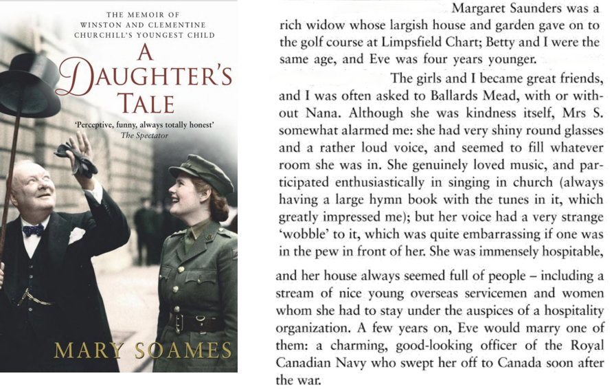 According to the memoirs of Winston Churchill’s youngest daughter Mary Soames, Mrs. Margaret Saunders was a “rich widow” whose two daughters Betty and Eve were great friends of Mary. (Below is an extract from the book).