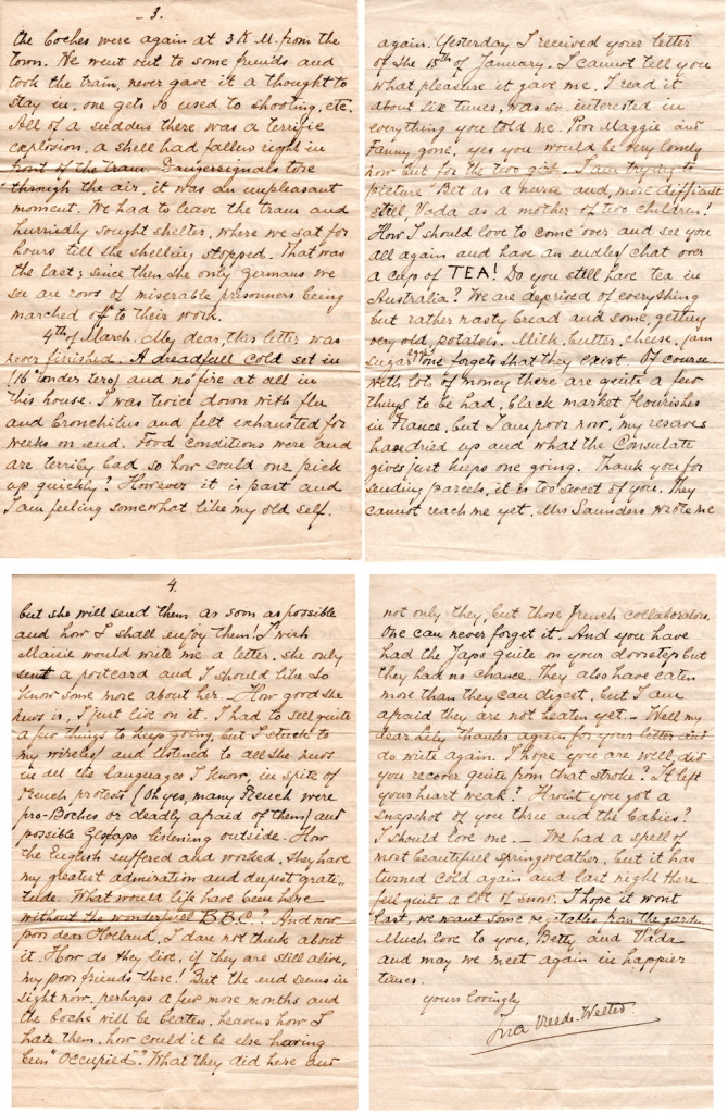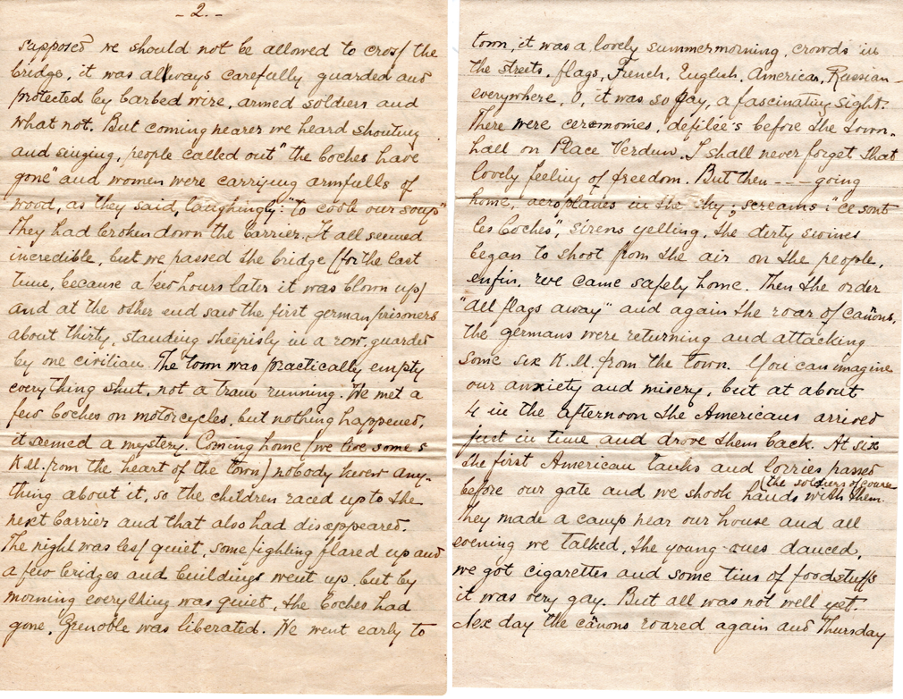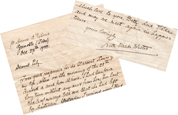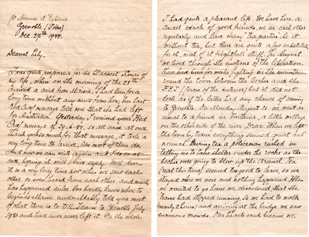 “I was quite prepared for the blackest Xmas of my life when on the rmorning of the 25th arrived a card from Maisie. I had been for a long time without any news from her; her last Red Cross message told me that she had left for Australia… I came to Grenoble in July 1941 and have never left it… In August we lived through the emotions of the Liberation..”