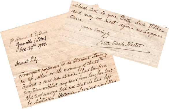 In that letter she thanked Lily for sending her Red Cross parcels via a Mrs Saunders in England. It would appear that Mrs Saunders took in Ina and possibly Maisie for a while as well. She had a grandiose address, “Ballards Mead” in Ballards Lane, Limpsfield, Surrey – an address which Maisie was later to use. The inference from the wording of Ina’s letter is that Lily d’Archy introduced Ina to Mrs Saunders. Perhaps Vada and Betty d’Archy and also Maisie were friends of Mrs. Saunders’ daughters.