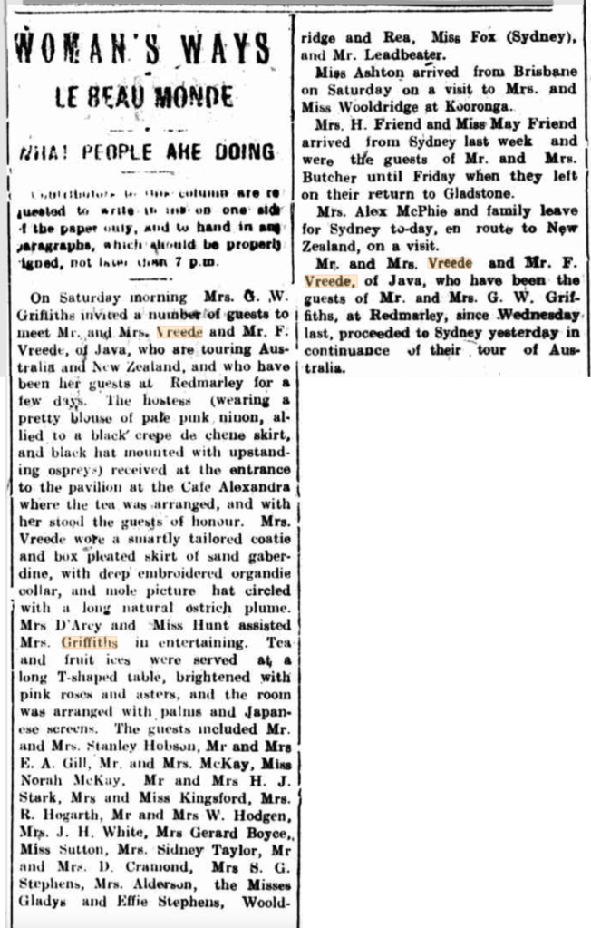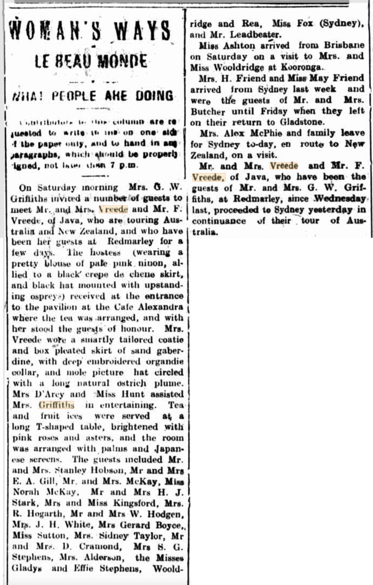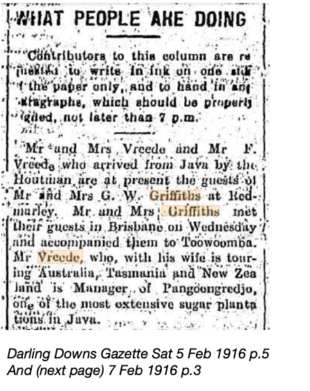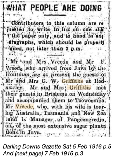 The Darling Downs Gazette on 7 February 1916 published a story under the heading Woman’s Ways – Le Beau Monde – What People are Doing. A similar but less lengthy article had also appeared in the same newspaper two days earlier which stated the Griffiths had met their guests in Brisbane and accompanied them to Toowoomba. Also that “Mr Vreede who with his wife is touring Australia, Tasmania and New Zealand, is the Manager of Pangoongriedjo, one of the most extensive sugar plantations in Java.“