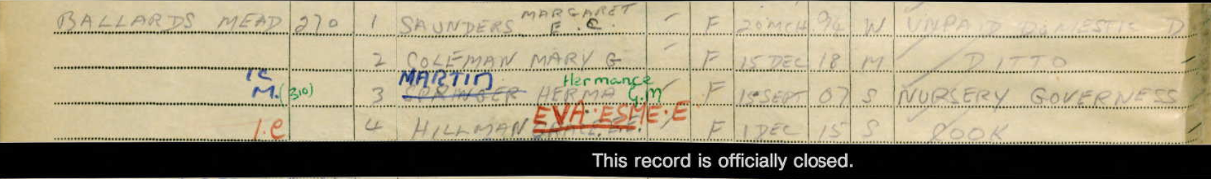 The 1939 Register for England shows Mrs Saunders was born in1894 and at the time of the Register was aged 45 and had five unrelated people living with her – including a nursery governess and a cook. Ina was not in this Register; nor was Maisie, who we know was living in Harlesden close to London.